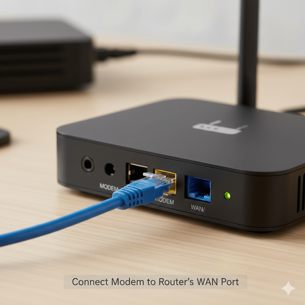 - Plug the other end into the router’s WAN or Internet port (usually a different color from the LAN ports).